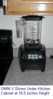 The OMNI V Blender will fit with its 2 liter 64oz CO-POLYESTER BPA-FREE square container (Eastman Tritan) under your kitchen cabinets, just like with the competitors from Orem Utah, (see picture to the right). A tamper made out of wood (poplar dowel) is provided for free of charge.