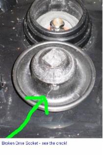 easily by pushing down and pulling on the socket several times until it comes off. If there is a crack in it as shown in above - right image, the drive socket will easily fall off. If the socket does not come off, not even with unscrewing the screw, then call us. You may have to return the blender to us so we can repair it for you. We want to avoid this because it also means longer down-time for you. It is much faster for us to send you a new socket by First-Class Mail