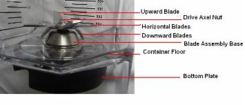 If something is stuck right below the blades in the far corners (and that could apply to any blender container brand), either taking off the container after you stop the blender motor, and shaking it carefully without spilling, or adding little water, might help. And remember, as long as you use water or some kind of a foodstuff liquid or juice, just enough to keep the content moving, you will never get stuck. Real tricky ingredients are ice cubes, flax seed, and any other oily dry goods, and when blending nut-butter in less than 8 oz quantity. They sometimes pile up on the side of the container wall and the blade cannot reach the content anymore and just turns without any further ingredients movement inside. That is when you need to either shake the content, stir it or add liquid... - SEE VIDEOS