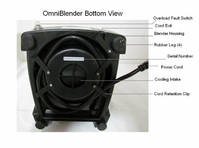 Let the cord exit at this appropriate area for proper blender setup. Make sure that the bottom vent areas are unobstructed. And while you are looking at the back and bottom of your blender motor base, please also note the power-shut-off or overload reset button. It is on the right bottom back-side of the motor housing when you stand in front of your 3 hp OMNI blender.
