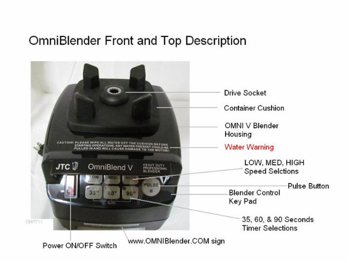 Before operating your blender, make sure that there is no water on the blender base, on top of the container cushion, or near the bottom of the blender base housing Power Plug/Cord Storage Area and Rubber Feet. Although the OMNI Blender is equipped with a seal/gasket on top under the housing where the drive socket is, it still could vacuum in / suck in water into the inside of the motor housing through any of its openings for venting. Water will obviously cause damage to the motor and/or any of the electronic switches.